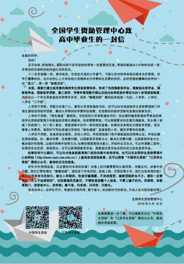 如果你有什么疑问,可以向当地县级教育部门或你的高中老师咨询,也可以在全国学生资助管理中心的网站(http://www.xszz.cee.edu.cn)上查询各项资助政策,还可以搜索“中国学生资助”“江苏学生资助”微信公众号,查询你关注的信息。